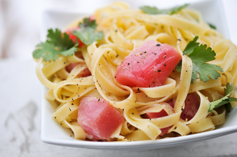This dish was fantastic. This was a lemon butter wasabi pasta with some ahi tuna, and a little bit of cilantro for color. Really easy to make, cook pasta, juice lemon, melt butter, put it all over the pasta, slice some ahi, and you’re good to go. Don’t forget the fresh cracked pepper. I’m such a fan of cracked pepper on dishes like this, it really just seems to bring out the flavor.